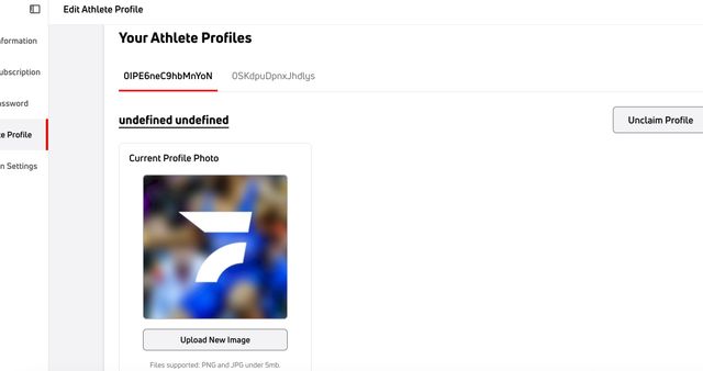 The page will then show tabs for each of the profiles that you have claimed. You can upload a new profile photo at any time. You can also unclaim the profile if you want to transfer access to the athlete or another parent/guardian.