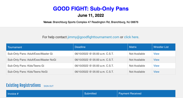 If an event does not have multiple TW tournaments and is allowing double bracketing in its settings, you can register for multiple styles/divisions/weight classes as long as they are on the same invoice. If you submit payment for one style/division/weight class in a single pre-reg, you will not be able to add a new invoice for the same person.